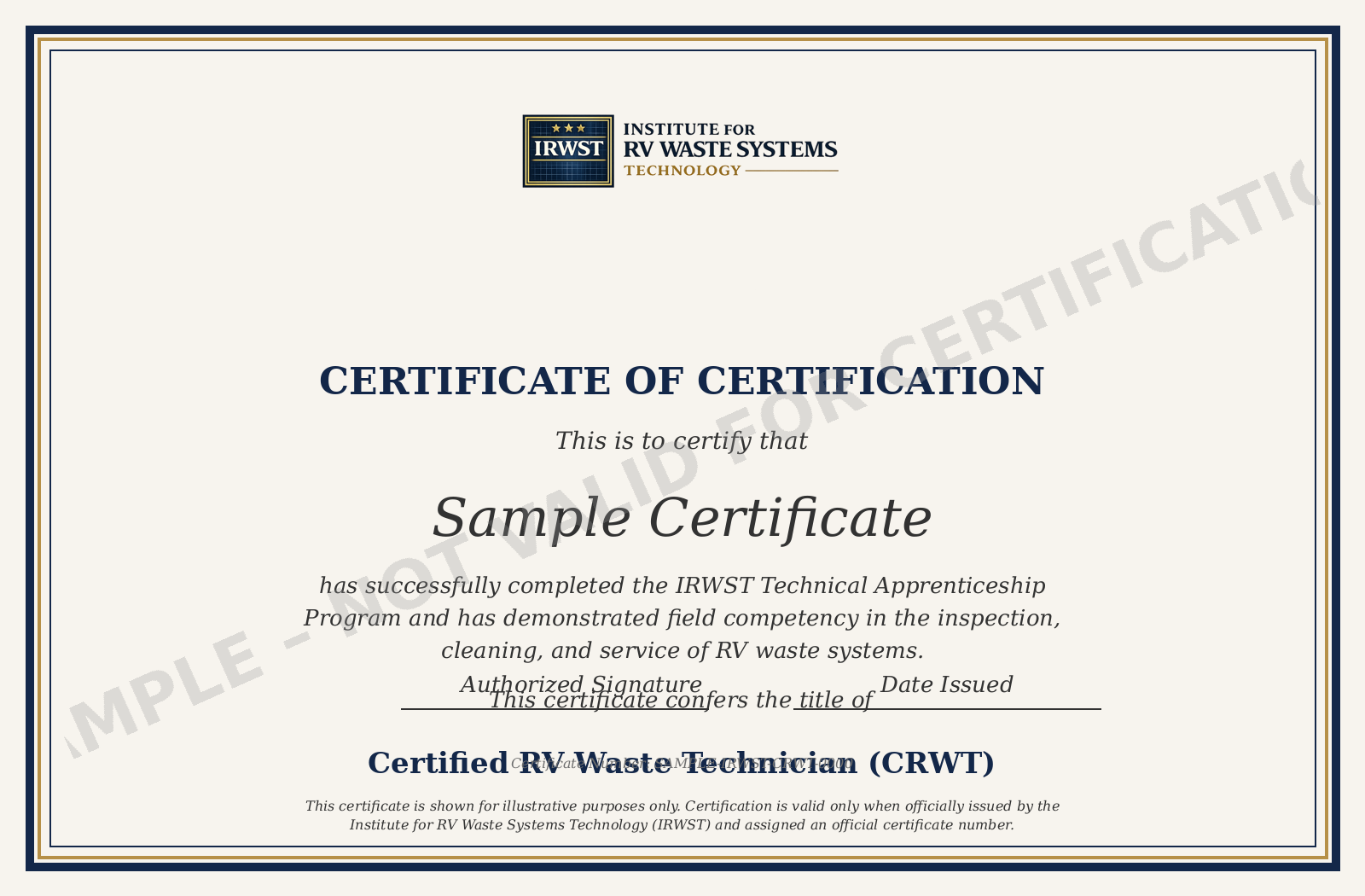 The CRWT designation indicates that an individual has successfully completed the IRWST apprenticeship and demonstrated field competency in the inspection, cleaning, and service of RV waste systems.